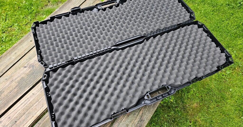 The case itself is built from polypropylene with multiple locking points, and the heavy-duty latches have held up to years of use without loosening. Inside, the convoluted foam padding keeps rifles from shifting around. It measures about 41″ long, 13″ wide, and 5″ deep, giving plenty of room for optics and accessories without feeling too oversized to carry.